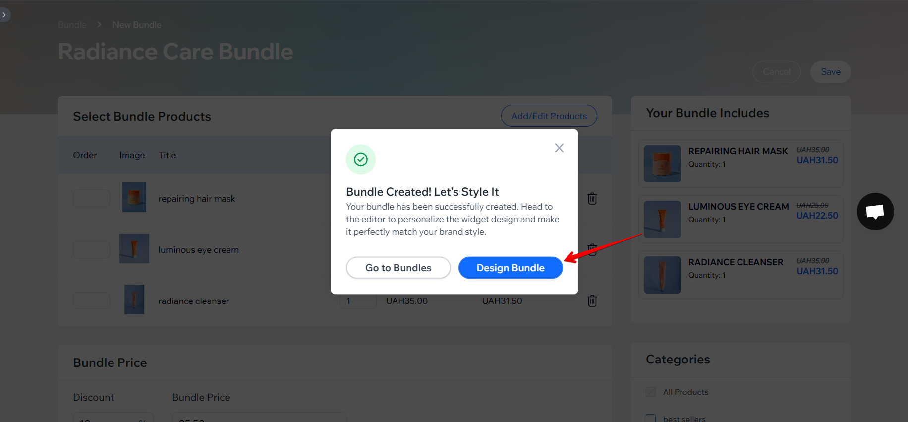 Click the “Design Bundle” button to open the Wix Editor, where you can customize the bundle widget’s appearance.